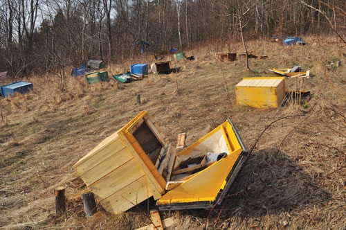 Karol Czarnecki z Terki ma pasiekę na skarpie za domem. 10lipca w nocy obudził go głuchy łomot. Wybiegł z domu i zobaczył roztrzaskaneule. Jeden się stoczył i uderzył w ścianę domu. – Napastnik szybko się oddalił– opowiada Czarnecki. – Rano zgłosiłem szkodę do RDOŚ, przyjechała ekipaszacująca i sprawnie wyliczyła moje straty. Dostałem blisko 2 tys.odszkodowania, ale co mi z pieniędzy, skoro straciłem pszczoły? Dwa dnipóźniej pszczelarz zamontował pastuch elektryczny, ale dodatkowo przez trzynoce osobiście pilnował pasieki. Gdy tylko niedźwiedź się zbliżał, psynatychmiast ujadały. Nie wiadomo, czy właśnie to go powstrzymywało przedsforsowaniem ogrodzenia, czy może instynkt. – Podchodził najwyżej na trzymetry do pastucha, a potem długo węszył – mówi pan Karol. – Cztery razytak się zdarzyło, jednak ani razu nie zdecydował się na dotknięcie ogrodzenia.
