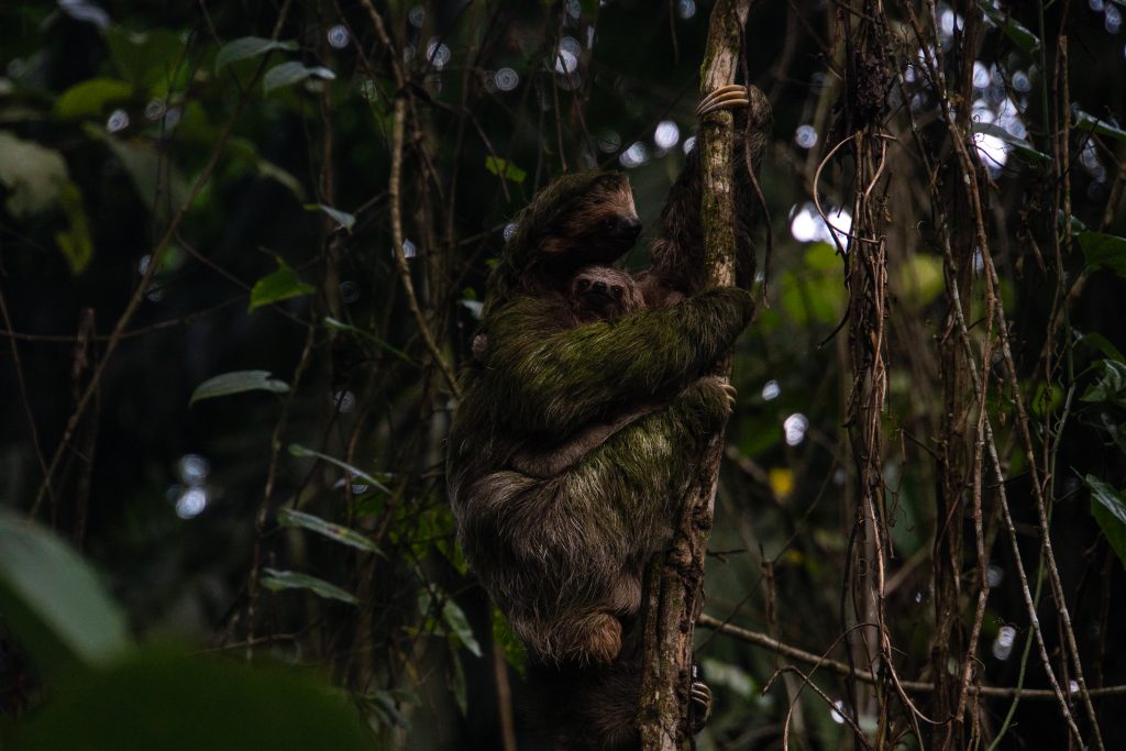 Po 20 minutach docieram do celu. Znowu mam szczęście – nie ma nikogo. Czekam. Mocno skoncentrowany skanuję korony drzew. Podobno najciemniej pod latarnią i faktycznie, po chwili dostrzegam, tuż nad moją głową, leniwca, a nawet dwa osobniki. Dokładnie mamę z małym. Niesamowite! Są bardzo blisko. Delektuję się tym widokiem, robię zdjęcia, ale to nie koniec atrakcji. Leniwiec z małym decyduje się zejść na ziemię po cienkim pnączu. To rzadkie, bo zwykle dzieje się to raz na tydzień. Po zejściu i szybkiej toalecie wracają od razu na drzewo, w korony drzew. Mam idealny widok i zdjęcia. Nie zapomnę tej przygody przez długi czas. Zadowolony wracam do wyjścia, wsiadam do mojej terenówki z namiotem na dachu i ruszam dalej. Ku przygodzie…