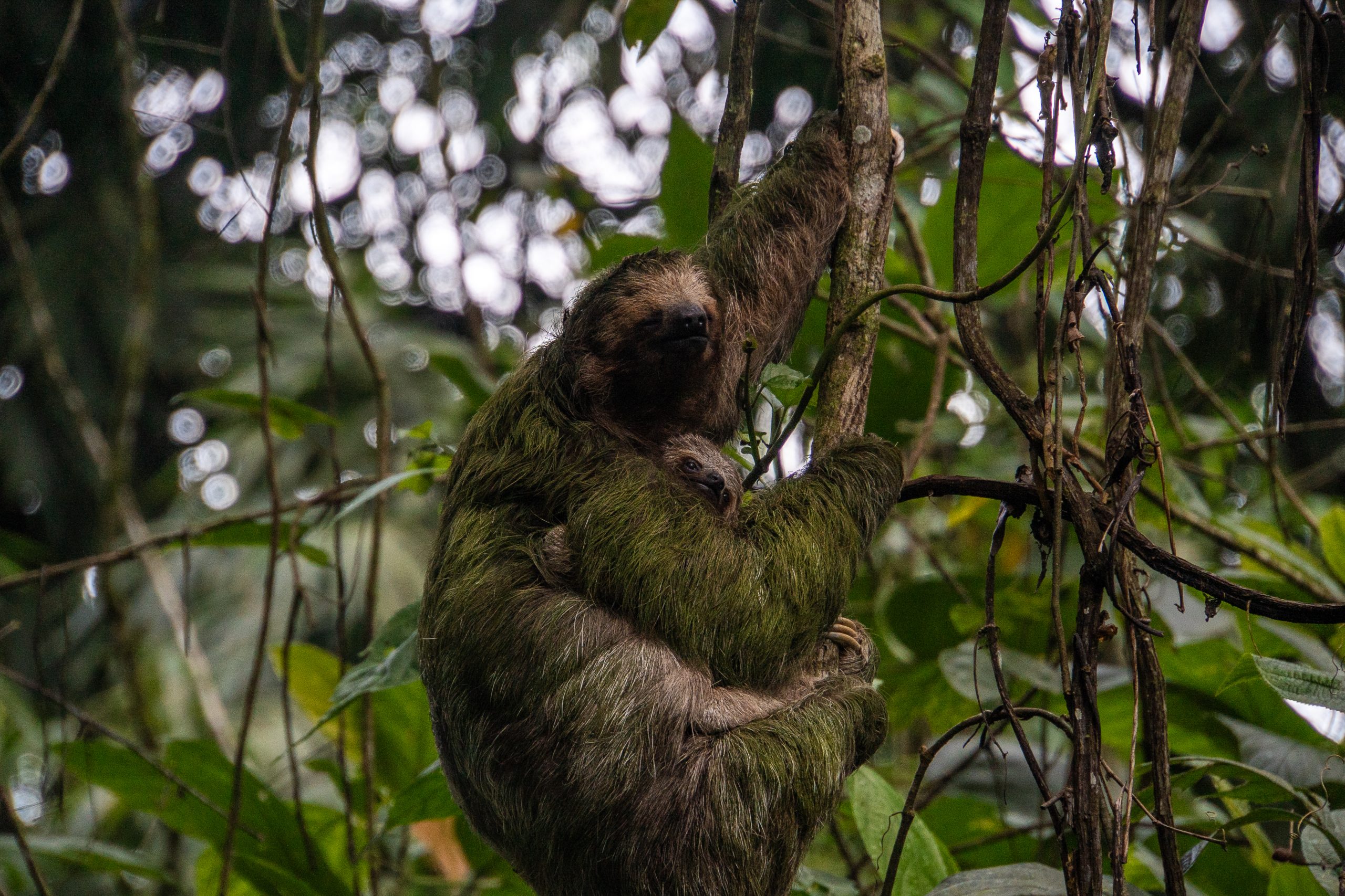 Po 20 minutach docieram do celu. Znowu mam szczęście – nie ma nikogo. Czekam. Mocno skoncentrowany skanuję korony drzew. Podobno najciemniej pod latarnią i faktycznie, po chwili dostrzegam, tuż nad moją głową, leniwca, a nawet dwa osobniki. Dokładnie mamę z małym. Niesamowite! Są bardzo blisko. Delektuję się tym widokiem, robię zdjęcia, ale to nie koniec atrakcji. Leniwiec z małym decyduje się zejść na ziemię po cienkim pnączu. To rzadkie, bo zwykle dzieje się to raz na tydzień. Po zejściu i szybkiej toalecie wracają od razu na drzewo, w korony drzew. Mam idealny widok i zdjęcia. Nie zapomnę tej przygody przez długi czas. Zadowolony wracam do wyjścia, wsiadam do mojej terenówki z namiotem na dachu i ruszam dalej. Ku przygodzie…