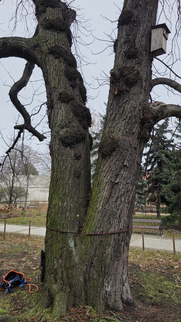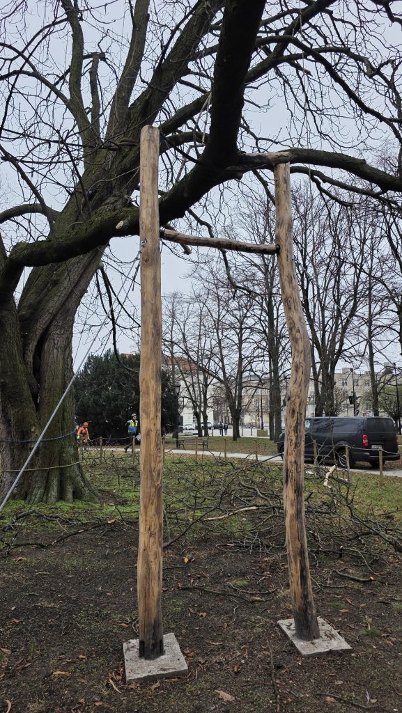 Zastosowano innowacyjne rozwiązanie techniczne – podporę, która pozwala na pracę konaru i wspiera go podczas silniejszych podmuchów wiatru. Zalecono też dalszą obserwację cennych drzew, która jest stale realizowana.