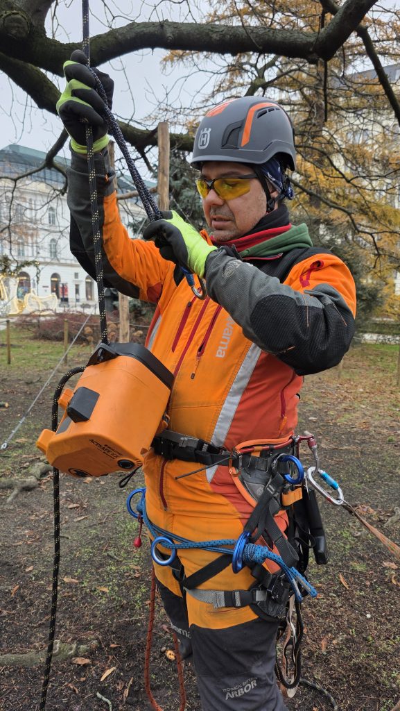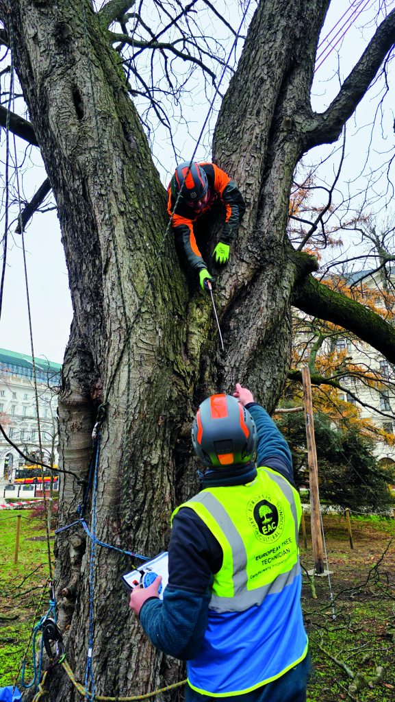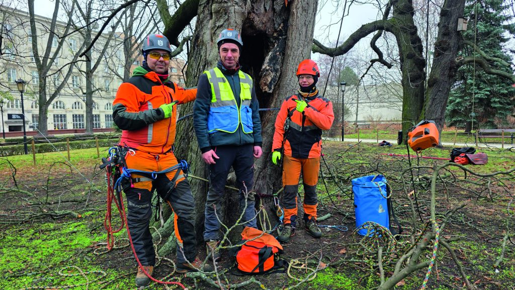 Z góry widać więcej. Wielu leśników o tym wie, pamiętają o tym też dendrolodzy. Inspekcja prowadzona w koronach drzew umożliwiła wykrycie uszkodzeń niewidocznych z poziomu gruntu. Badanie rozwidleń konarów odbywało się poprzez opukiwanie młotkiem i sondowanie. Sprawdzano obecność rozkładu, nieprawidłowych zrostów czy zakorków, które mogły prowadzić do rozłamań. Kontrolowane obciążanie konarów pozwoliło zbadać ich reakcję na stopniowe przykładanie siły oraz stopień i miejsce ich uginania. W trakcie prac wysokościowych zidentyfikowano obecność hubiaka pospolitego.