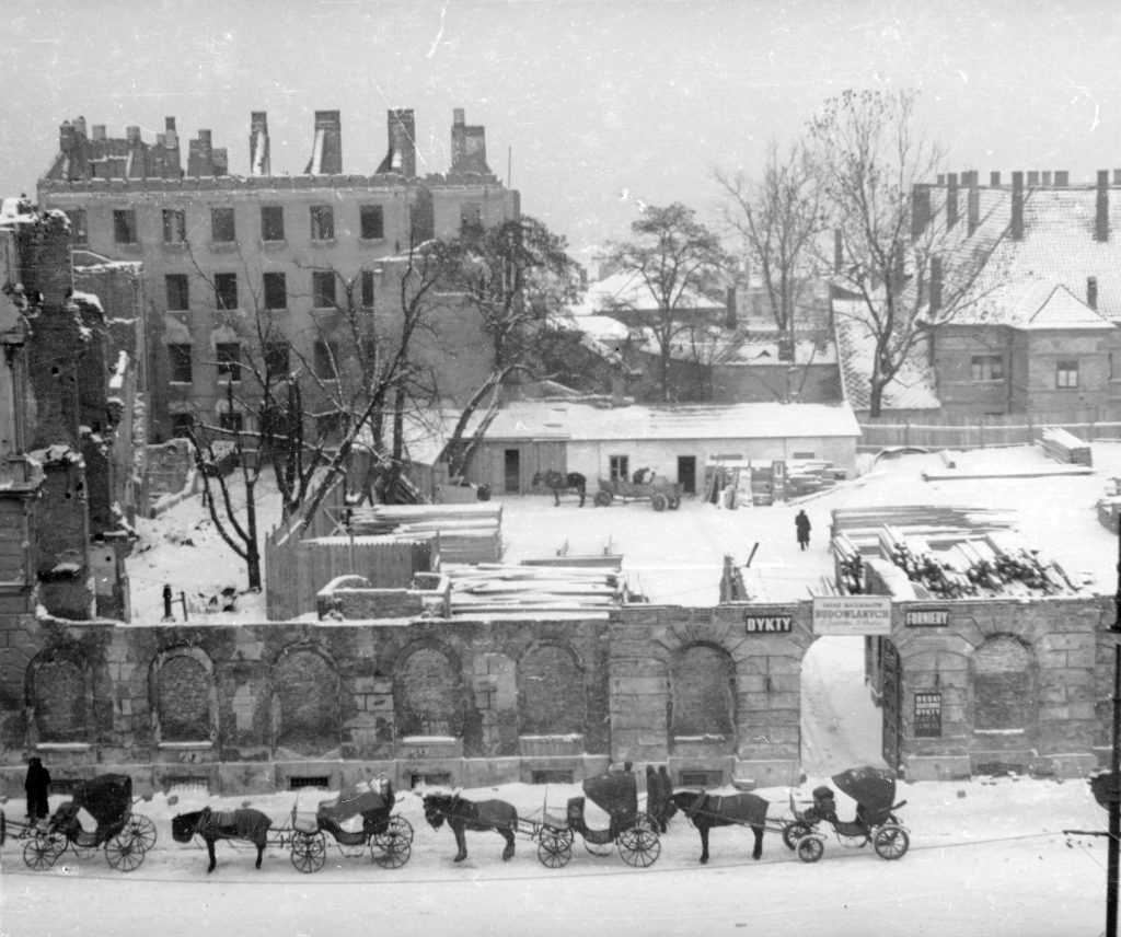 Na fotografii z 1945 r. widać już dorodne, majestatyczne drzewa rosnące na dziedzińcu po wyburzonej kamienicy nr 36, gdzie później funkcjonował skład materiałów budowlanych. W wyniku działań wojennych drzewa zostały zniszczone i pozbawione koron. Kolejne zdjęcie z roku 1977 dokumentuje próby wsparcia drzew przez charakterystyczny dla tamtych czasów zabieg „chirurgii drzew” – wypełniania betonem rozległych ubytków. Już wtedy jeden z kasztanowców wykazywał cechy drzewa-weterana.