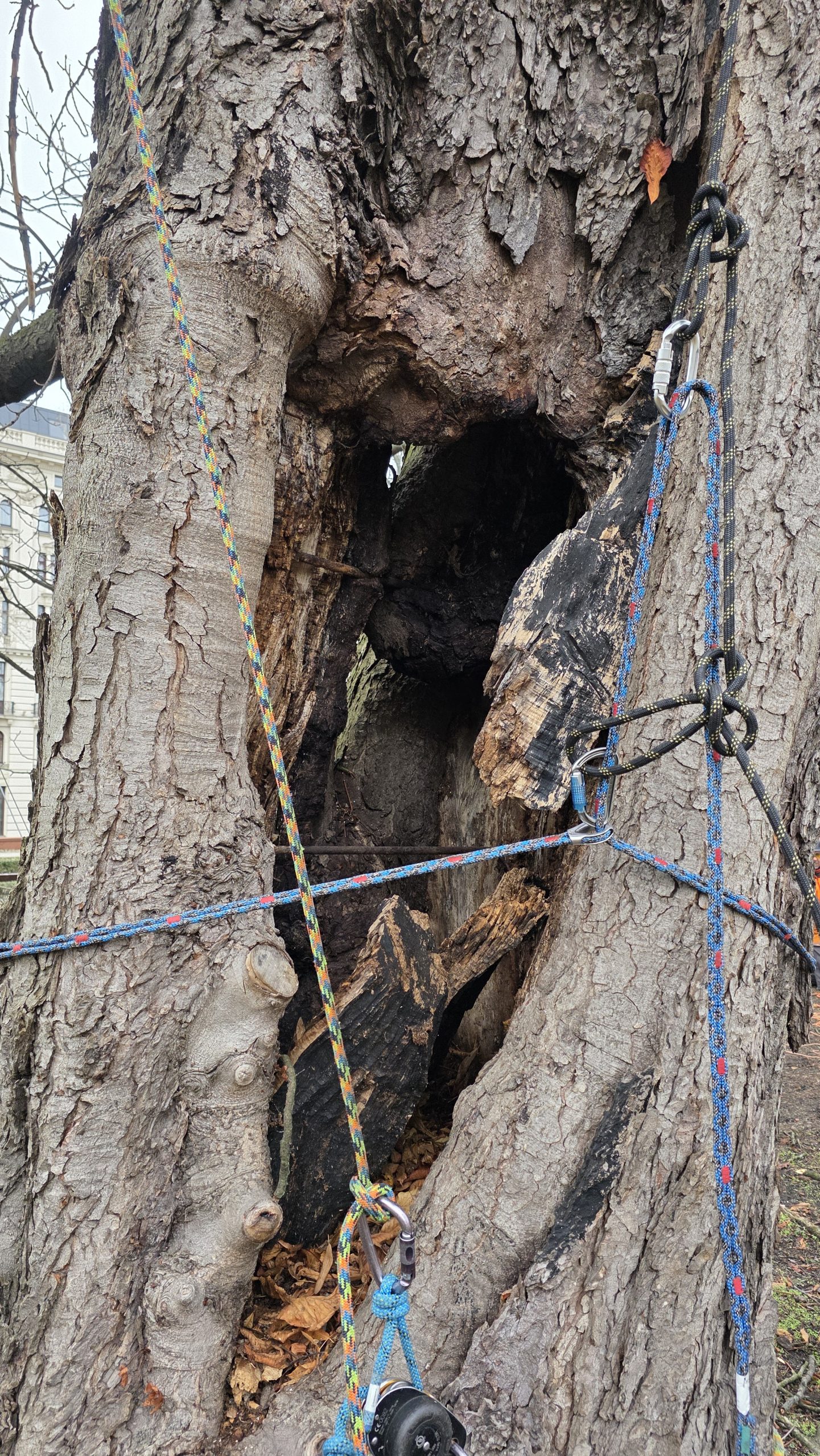 Podpora pod najniższym północnym konarem jednego z kasztanowców – strategicznej części dla fizjologii i witalności drzewa