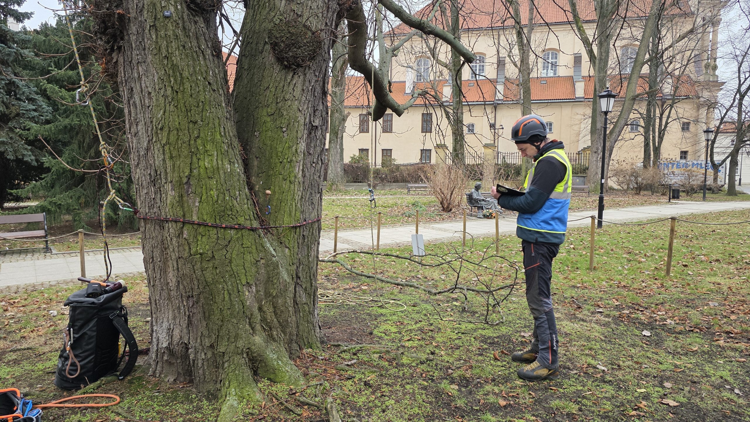 Z góry widać więcej. Wielu leśników o tym wie, pamiętają o tym też dendrolodzy. Inspekcja prowadzona w koronach drzew umożliwiła wykrycie uszkodzeń niewidocznych z poziomu gruntu. Badanie rozwidleń konarów odbywało się poprzez opukiwanie młotkiem i sondowanie. Sprawdzano obecność rozkładu, nieprawidłowych zrostów czy zakorków, które mogły prowadzić do rozłamań. Kontrolowane obciążanie konarów pozwoliło zbadać ich reakcję na stopniowe przykładanie siły oraz stopień i miejsce ich uginania. W trakcie prac wysokościowych zidentyfikowano obecność hubiaka pospolitego.
