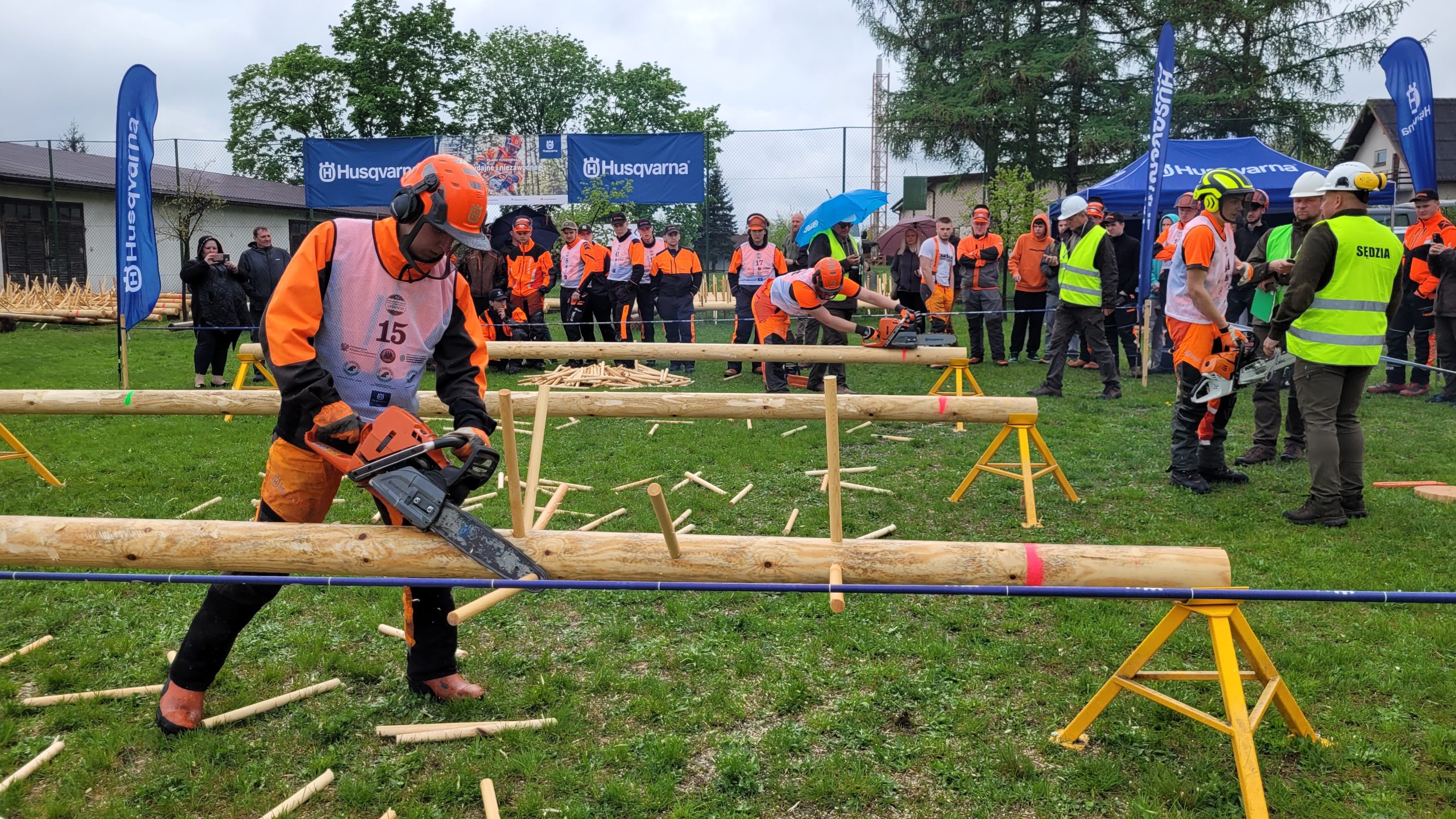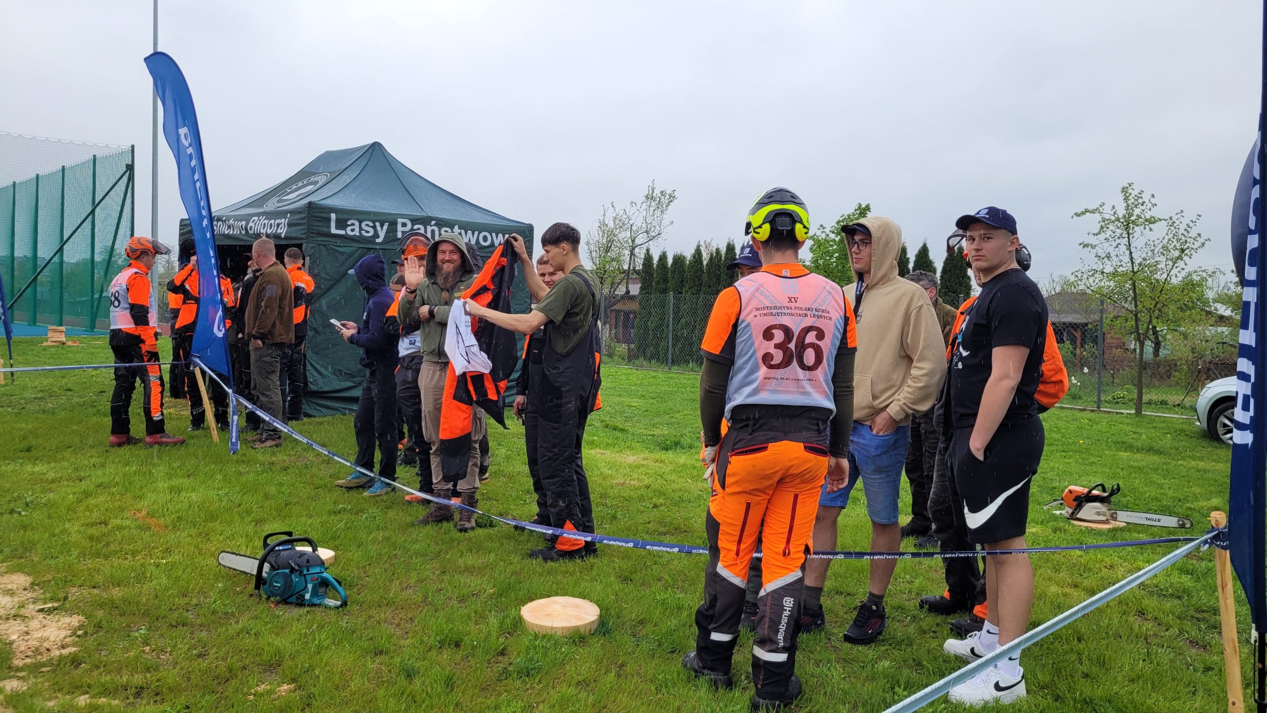 Choć pierwszego dnia mistrzostw pogoda sprzyjała, to drugiego – rozgrywanego na terenie ZSL w Biłgoraju – padający deszcz zdecydowanie utrudniał zawodnikom zaplanowane na ten dzień konkurencje. Z jednej strony zmagali się z emocjami związanymi z zawodami, ale z drugiej doświadczyli, że praca pilarką w mokrym drewnie jest inna. Było to szczególnie widoczne podczas konkurencji okrzesywania, gdy łańcuchy pilarek ślizgały się na kłodach. Niektórym zawodnikom spadł łańcuch, a niektórzy w zdenerwowaniu założyli łańcuchy… odwrotnie! W konkurencji wymiany łańcucha tnącego aż trzech zawodników uzyskało wynik 122 pkt, a byli to: Franciszek Janota z Brynka oraz dwóch uczniów z Goraja – Bartłomiej Spychała i Jano Felsman. Tylko dwa punkty mniej uzyskał Bartosz Skamruk z Biłgoraja. Natomiast drużyna ze Starościna nie uzyskała ani jednego punktu w tej konkurencji.