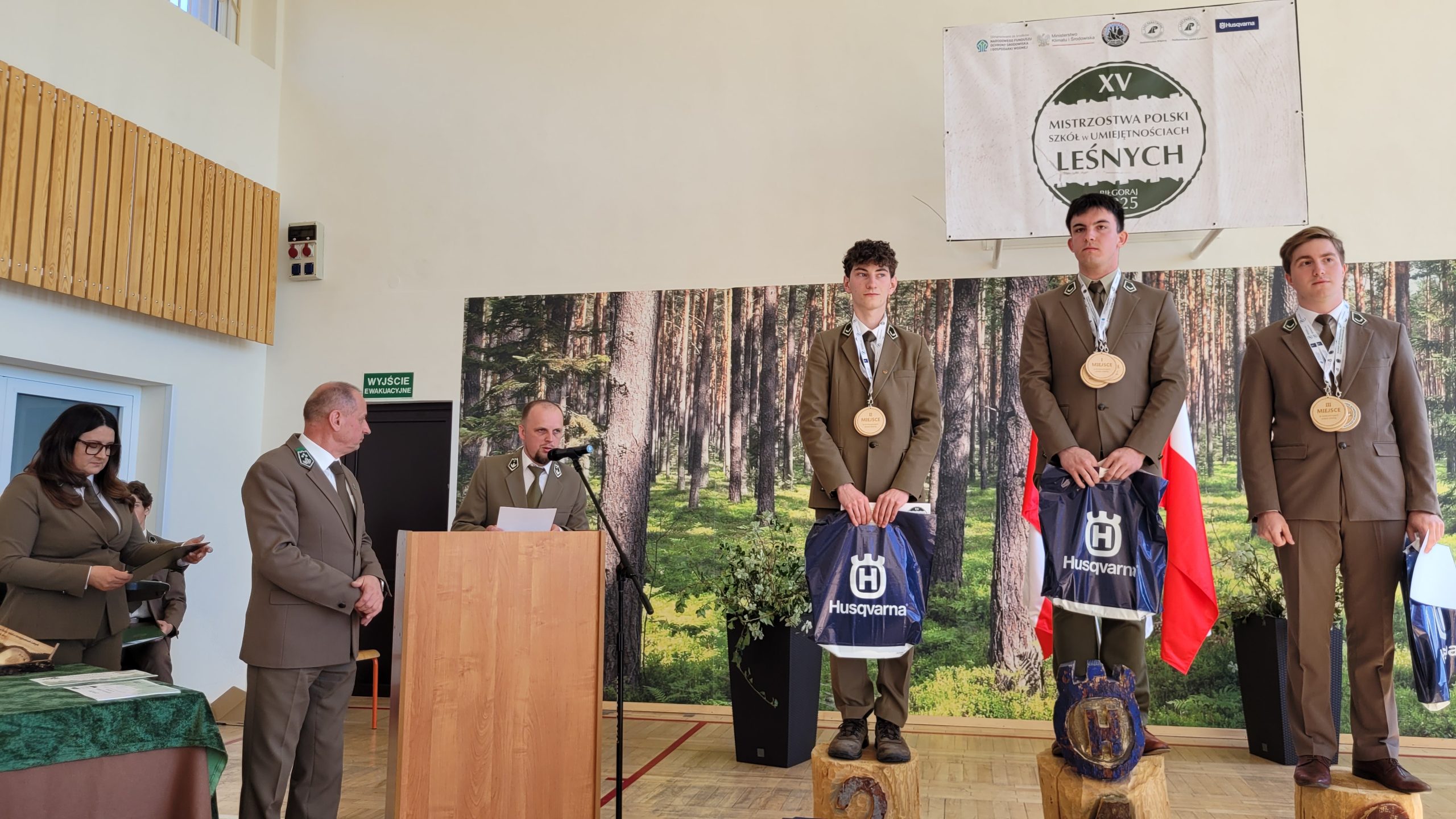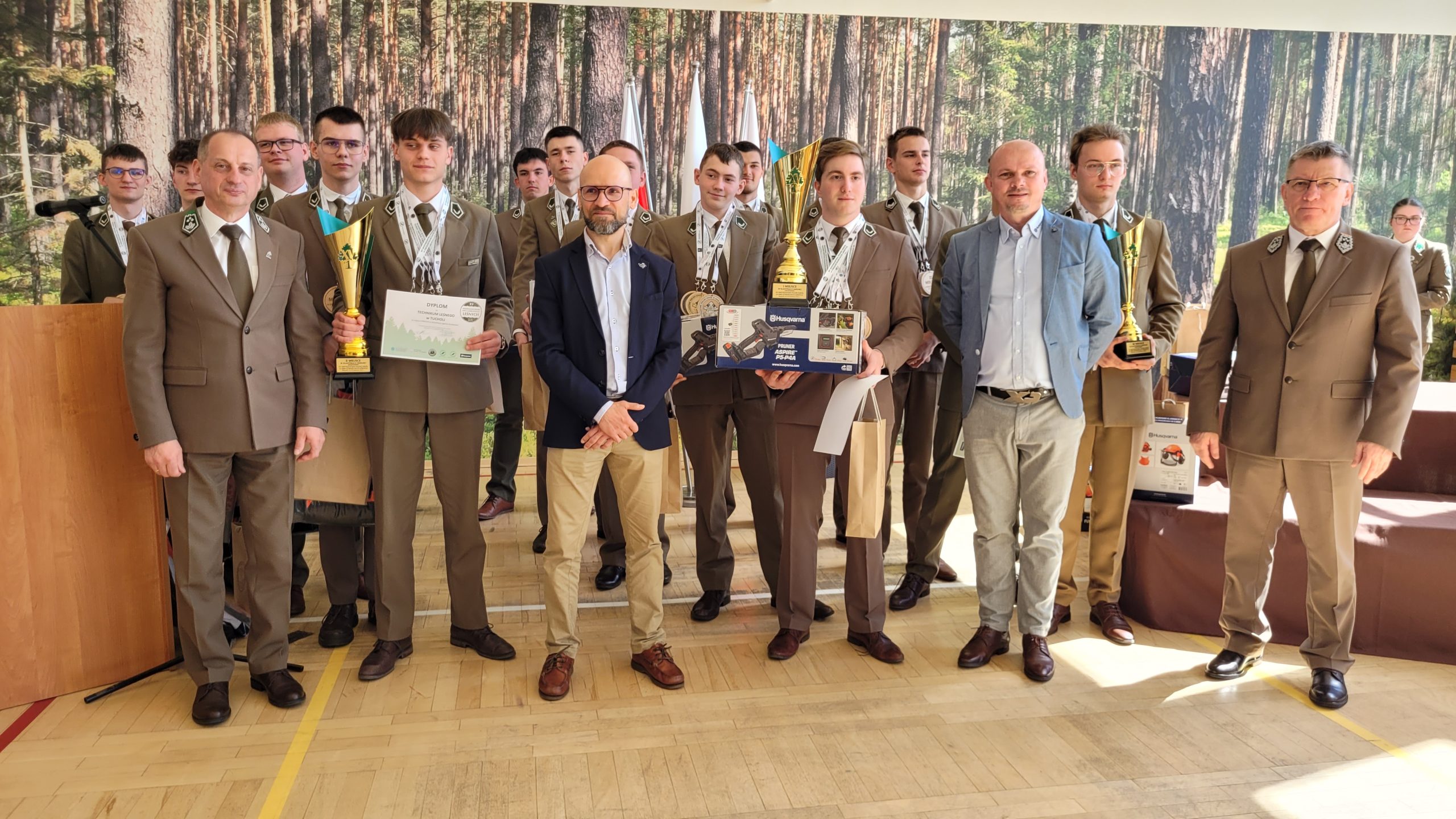 – Szczególne podziękowanie należy się dwóm wyjątkowym osobom – Tomaszowi Maternowskiemu i Januszowi Iwańczykowi, których wkład w organizację mistrzostw jest nie do przecenienia – podsumował dyrektor Przytuła. Podziękował również opiekunom drużyn i sędziom za zaangażowanie, swoim zastępcom, nauczycielom oraz sponsorowi licznych nagród – firmie Husqvarna, którą reprezentował podczas zmagań w Biłgoraju Łukasz Błoniarz, a wsparciem był Konrad Smektała. Dyrektor Departamentu Leśnictwa i Łowiectwa w MKiŚ Łukasz Łatała i dyrektor Regionalnej Dyrekcji LP w Lublinie Jan Kowal wraz z dyrektorem szkoły Adamem Przytułą wręczyli medale, nagrody i puchary. Gratulacjom, radości i niespodziankom nie było końca!